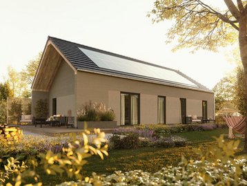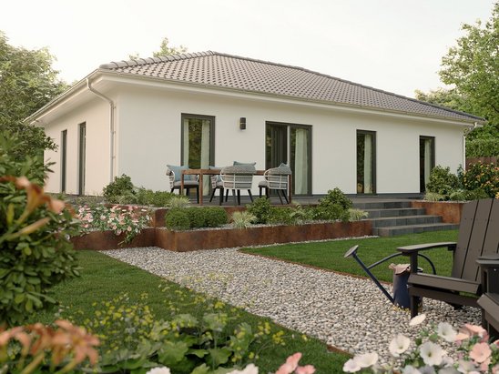 Der Bungalow 110 bietet auf einer Ebene ein helles Wohnzimmer mit Essbereich, ein Schlafzimmer und zwei weitere Zimmer. Große Fenster schaffen eine freundliche Atmosphäre. Mit direktem Zugang zum Garten und charmantem Walmdach ist er ideal für Familien, die Nähe und individuellen Freiraum schätzen – stufenlos glücklich!