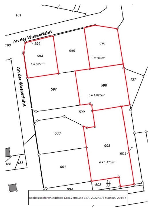 Fläche der Baugrundstücke: zwischen 595 m² und 1473 m²