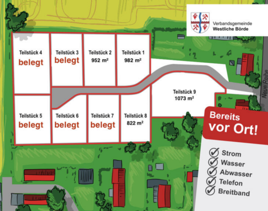 Die Gemeinde Westliche Börde veräußert derzeit noch 3 freie Bauplätze im Baugebiet "Neue Reihe" / "Neuer Hof" in Wulferstedt.