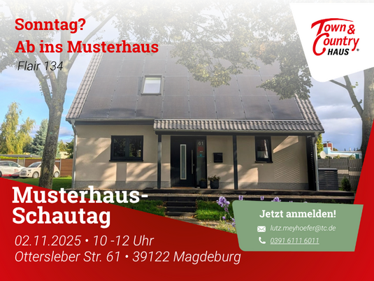 Am Sonntag, den 02.11.2025, öffnen wir von 13 bis 15 Uhr die Türen unseres Musterhauses Flair 134 in der Ottersleber Straße 61, 39122 Magdeburg.